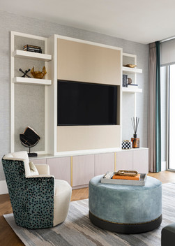"In the formal seating area, I added a light teal armless corner sofa and paired it with a circular coffee table, which created a calming fluidity. I also added a contrasting occasional chair with a floral fabric and a marble-top side table. This all sat surrounding a bespoke joinery unit, finished in taupe leather and tweed backboard to give a tactility and to soften the aesthetic. Not only does it house the television, but it also offers a display of objet d’art - the finishing personal touches to any space. I used a secondary rug to zone this area and for a soft and inviting feel on top of the hard flooring.